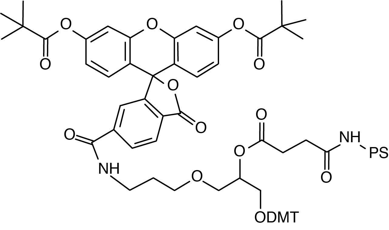 We offer five fluorescein supports. Fluorescein CPG has traditionally been used to add the fluorescein label at the 3’-terminus. The analogous structure, 3’-(6-Fluorescein) CPG, prepared using 6-FAM, is now also available, along with 6-Fluorescein Serinol CPG. We also offer 3’-(6-FAM) CPG and Fluorescein-dT CPG, both derivatives of 6-carboxyfluorescein (6-FAM). Both are single isomers and use an amide linkage which is stable during cleavage and deprotection and does not allow isomer formation. 3’-(6-FAM) CPG allows effective blockage of the 3’-terminus from polymerase extension as well as exonuclease digestion. Fluorescein-dT CPG allows both of these enzymatic activities to proceed. Normal cleavage and deprotection with ammonium hydroxide readily generates the fluorescein labelled oligos.