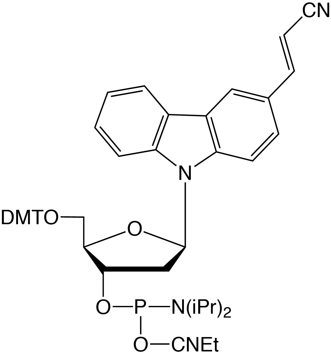 The ability to selectively photo-crosslink a complementary target DNA or RNA strand has a myriad of uses. However, traditional procedures to do so (e.g. psoralen) require long, 20 minute irradiation times with a crosslinking efficiency that is approximately 70%. Furthermore, the wavelength used for photo-reversal of the crosslink is typically 254 nm, which can lead to photoadducts such as a thymidine dimer. Professor Fujimoto from the Japan Advanced Institute of Science and Technology (JAIST) developed a novel photocrosslinker —3-cyanovinylcarbazole nucleoside (CNVK)—that shows a remarkable ability to photo-crosslink pyrimidines of target strands. Irradiation at 366 nm of a duplex containing CNVK opposite thymidine results in 100% cross-linking in 1 second and quantitative crosslinking opposite cytosine in 25 seconds. The photo-reversal of the crosslink was accomplished with irradiation at 312 nm in 3 minutes. This facile reversal reaction is therefore accomplished with no damage to normal DNA. Further research has shown that CNVK can also be cross-linked to an adjacent RNA strand.