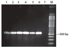 Lanes 1-6, PCR products of extracted DNA samples; |