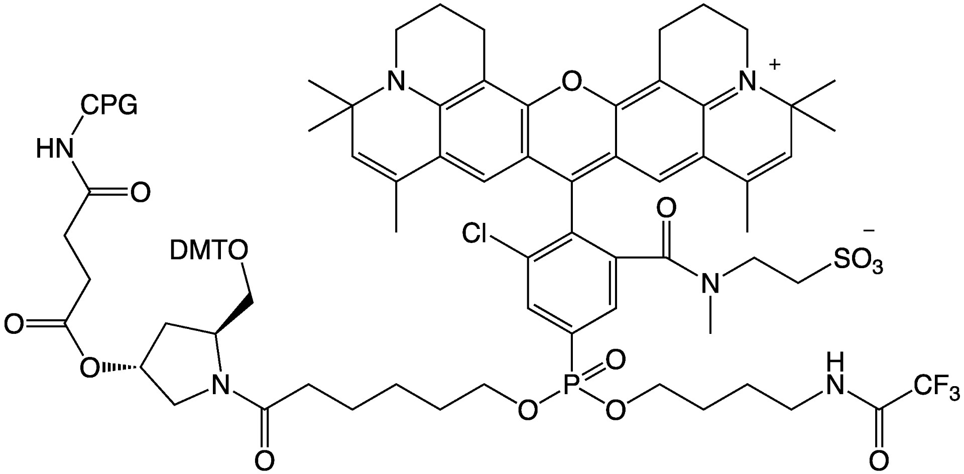 6-[2,3,16,17-tetrahydro-5,5,7,11,13,13-hexamethyl-1H,5H,13H,15H- Xantheno[2,3,4-ij:5,6,7-i'j′]diquinolizin-18-ium-9-yl-[2-chloro-6-(N- hydroxysulfonylethyl-N’-methylaminocarbonyl)-phen-4-yl] [trifluoroacetylaminobutoxy]phosphoryl][oxy]- hexanoyl-1-(2-O- dimethoxytrityloxymethyl)-pyrrolidin-4-yl-succinoyl long chain alkylamino-CPG