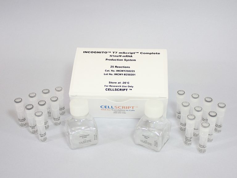 Cellscript’s INCOGNITO™ contain everything needed to make N1meΨ- or Ψ-containing Cap1 mRNA, including in vitro transcription reagents plus ScriptCap™ Capping Enzyme, ScriptCap™ 2’-O-Methyltransferase, and A-Plus™ Poly(A) Polymerase.