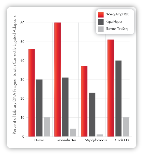 Figure 1. Percentage of library DNA with correctly ligated adaptors measured by qPCR. Duplicate libraries were prepped per kit/organism (Human, Staphylococcus aureus, Rhodobacter sphaeroides (1 library only), and E. coli)