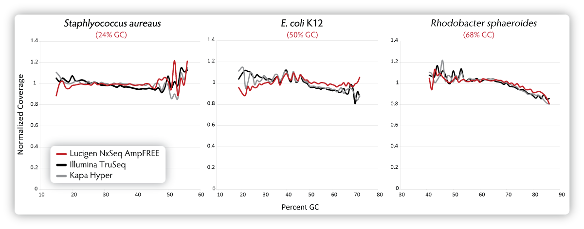 Figure 4. Sequencing bias measured for three different organisms with varying GC content. DNA fragment libraries were generated from gDNA of three organisms with varying GC content ( Staphylococcus aureus, 24% GC; E. coli K12, 50% GC; and Rhodobacter sphaeroides,