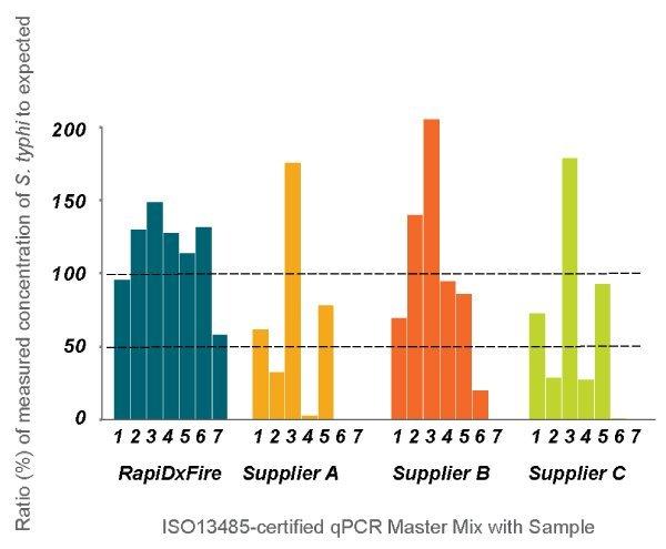 Figure 4. Comparison of RapiDxFire qPCR Master Mix to other competitor master mixes in quantifying Salmonella typhi among varying levels of other pathogenic bacteria. A series of multiplex experiments were performed to detect S. typhi in the background of increasingly abundant background of genomic DNA from pathogenic organisms, Escherichia coli, Pseudomonas aeruginosa, and Serratia liquefaciens. BHQ probe (200 nM) and primer (500 nM) concentrations were fixed for each experiment. Thermal cycling conditions were as stated by the manufacturer. Each reaction was run in 20 µL volumes with 5 µL of template to a final concentration of either 1,000,000 or 100 target copies (ratios indicated in Table 2). RapiDxFire qPCR Master Mix most accurately quantified S. typhi in all samples, and was the only master mix of appropriate sensitivity to reliably detect the presence of S. typhi in the most challenging sample