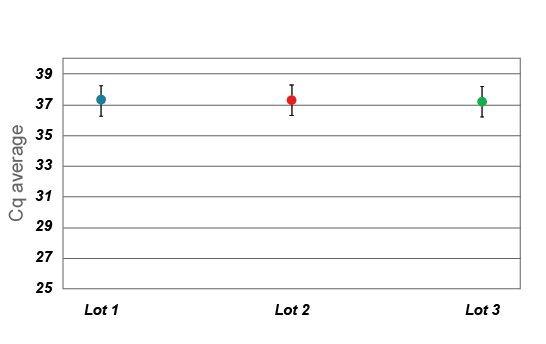 Figure 3. The Cq mean and standard deviation of three independent lots of RapiDxFire qPCR Master Mix. Three lots of BHQ Probe Master Mix were each tested with BHQ probes addressing four individual targets in a multiplex reaction. The cumulative deviation was < Cq 0.5 between each replicate (3 x 10 replicates) at the 10 copy level across three different lots.