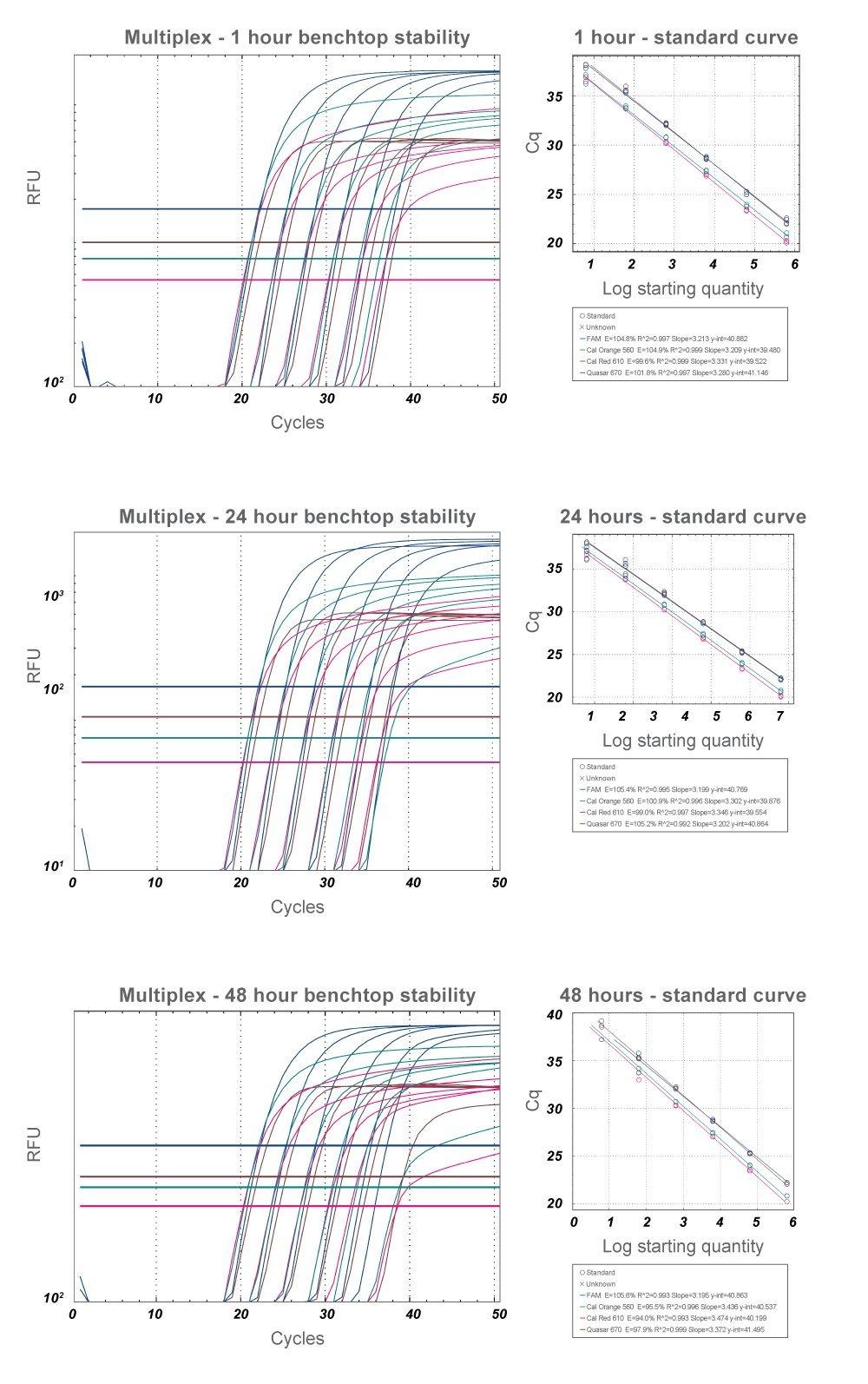 Figure 2. Amplification plots of a 4-plex RapiDxFire qPCR fully assembled reaction stored at room temperature over time prior to PCR cycling. We tested 1 hour, 24 hour or 48 hour pre-thermal cycling incubation times with reactions containing RapiDxFire qPCR Master Mix, BHQ assays, and DNA template. A multiplex assay targeting four individual mouse genomic DNA targets using BHQ probes and primers at a standard concentration of 200 nM and 900 nM, respectively, reporting with FAM and Biosearch Technologies proprietary dyes CAL Fluor Orange 560, CAL Fluor Red 610 and Quasar 670, was amplified using standard cycling conditions. A completely assembled reaction can be left on the bench for up to 48 hours without affecting the range of detection down to 10 copies.