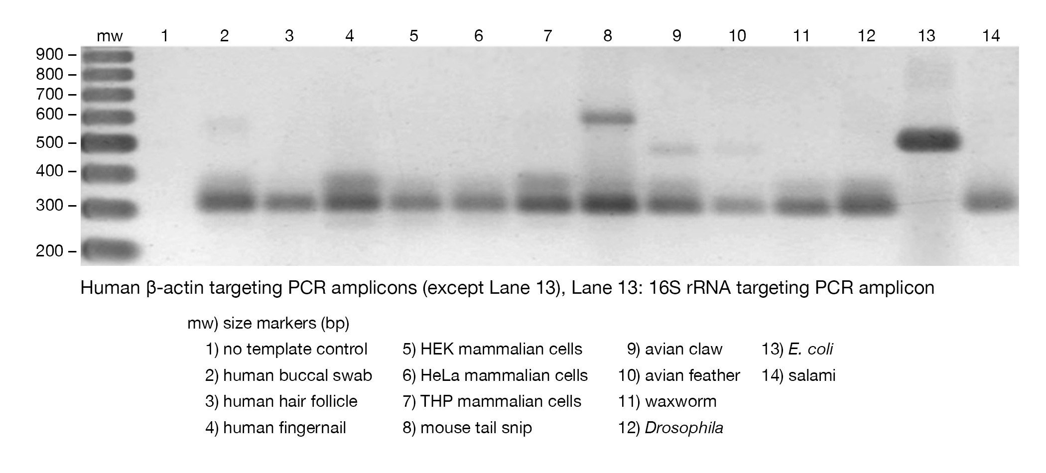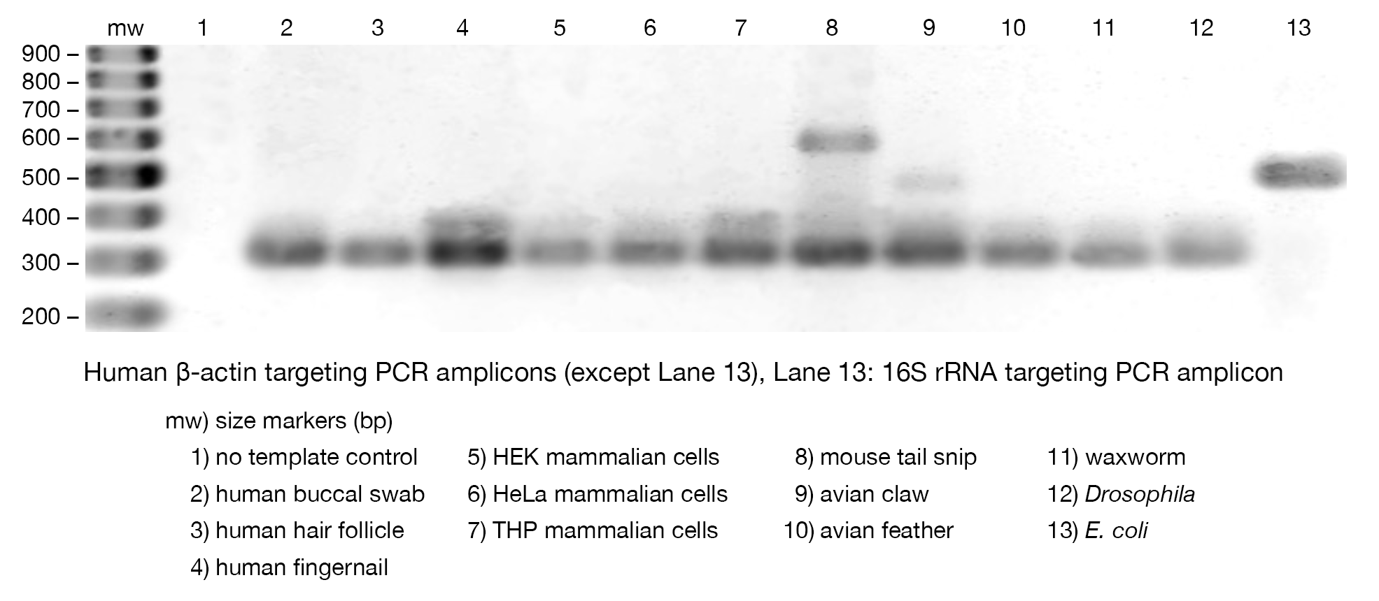 swabs, mammalian tissue culture cells, Escherichia coli and other Gram-negative bacterial cells, mouse tail snips, Drosophila and other insects, hair follicles, fingernails and feathers.