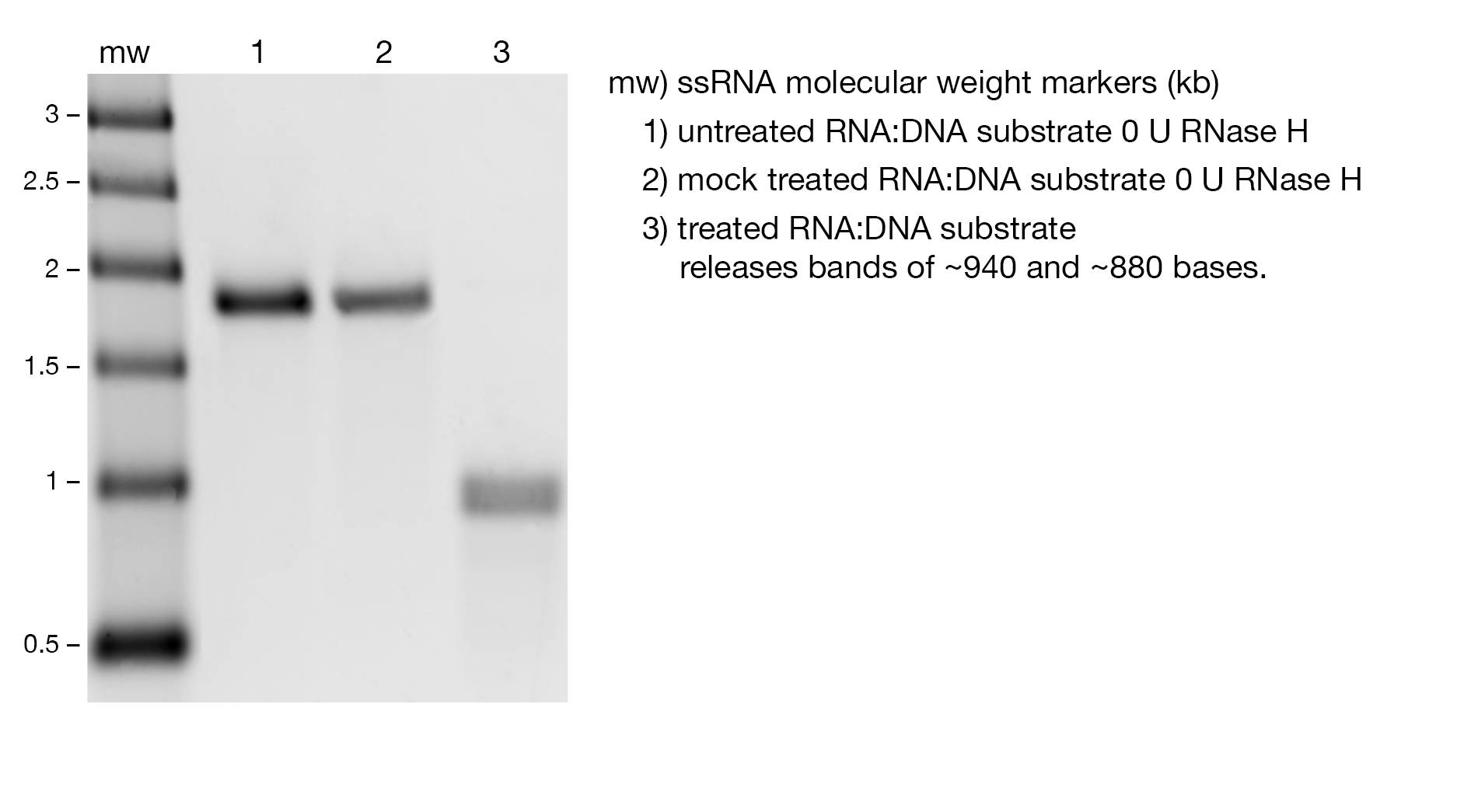 H (lane 2) and 0.5 U of RNase H (lane 3) show hydrolysis of the hybrid.