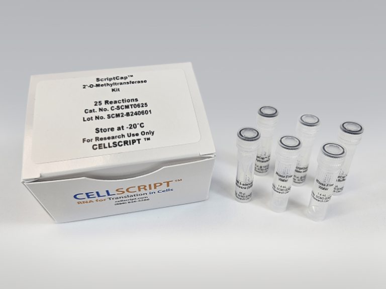 The ScriptCap™ 2′-O-Methyltransferase Kit provides conversion of Cap 0-RNA from any source to Cap 1-RNA with ~100% efficiency, a level that cannot be obtained using co-transcriptional capping methods. 5’ Capping enhances mRNA stability and translation efficiency in cells compared to uncapped RNA, with Cap 1 methylation further boosting in vivo translation efficiency. A standard reaction methylates 60 μg of Cap 0-RNA and can be scaled up or down to accommodate user needs.
