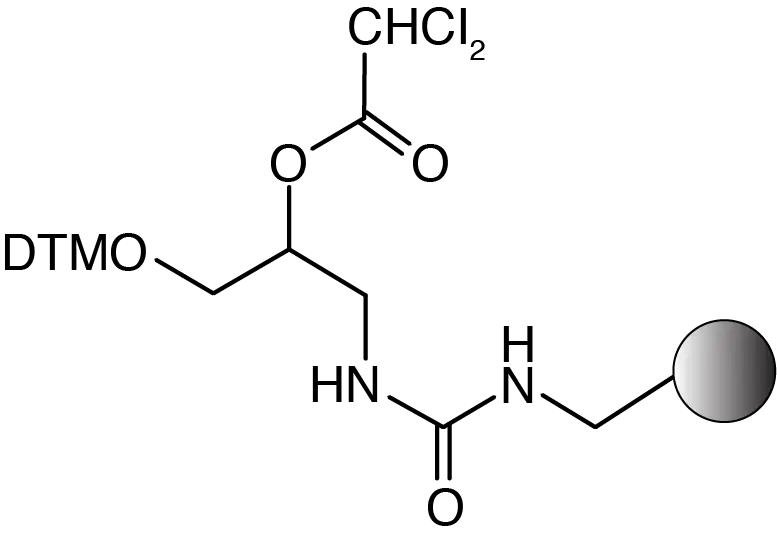 | 1-Dimethoxytrityloxy-2-O-dichloroacetyl-propyl-3-N-ureayl-polystyrene |
