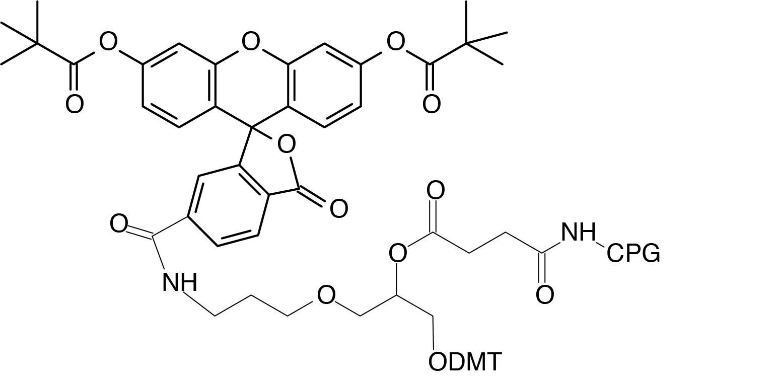 We offer five fluorescein supports. Fluorescein CPG has traditionally been used to add the fluorescein label at the 3’-terminus. The analogous structure, 3’-(6-Fluorescein) CPG, prepared using 6-FAM, is now also available, along with 6-Fluorescein Serinol CPG. We also offer 3’-(6-FAM) CPG and Fluorescein-dT CPG, both derivatives of 6-carboxyfluorescein (6-FAM). Both are single isomers and use an amide linkage which is stable during cleavage and deprotection and does not allow isomer formation. 3’-(6-FAM) CPG allows effective blockage of the 3’-terminus from polymerase extension as well as exonuclease digestion. Fluorescein-dT CPG allows both of these enzymatic activities to proceed. Normal cleavage and deprotection with ammonium hydroxide readily generates the fluorescein labelled oligos.