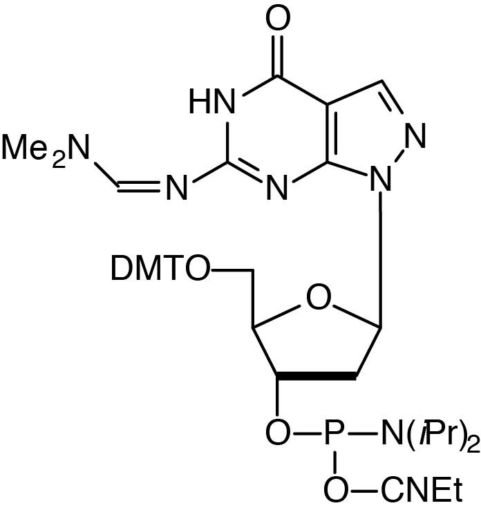The following products are used to investigate the effect on the activity of an oligonucleotide when key structural elements are changed. The 7-deaza purine monomers lack groups critical for hydrogen bonding. 7-Deaza-8-aza-A and 7-deaza-8-aza-G (PPG) monomers are isomers of A and G and have similar electron density. Their presence in oligos is slightly stabilizing relative to A and G. Unlike G, PPG does not lead to aggregation and G-rich oligos can be easily prepared and isolated. 5’-Fluorescein oligos with PPG at the 5’-terminus are much less quenched than the equivalent G oligos. As a purine analogue of Thymidine, 7-deaza-2’-deoxyXanthosine (7-deaza-dX) promises to have interesting effects on DNA structure of triplexes. 7-Deaza-dX also forms a non-standard base pair with a 2,4-diaminopyrimidine nucleoside analogue. Standard nucleobases have an unshared pair of electrons that project into the minor groove of duplex DNA. Enzymes that interact with DNA, polymerases, reverse transcriptases, restriction enzymes, etc., may use a hydrogen bond donating group to contact the hydrogen bond acceptor in the minor groove. 3-Deaza-2’-deoxyadenosine is very interesting in that it maintains the ability for regular Watson-Crick hydrogen bonding to T but is lacking the electron pair at the 3-position normally provided by N3.